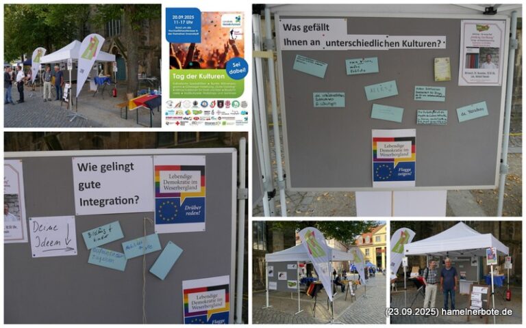 Hameln, 23.09.2025: Wir waren dabei und es hat Spaß gemacht! Der Landkreis Hameln-Pyrmont hatte gemeinsam mit der Stadt Hameln zum „Tag der Kulturen“ eingeladen und die Arbeitsgruppe Migration der „Allianz lebendige Demokratie im Weserbergland“ wollte mit dem Motto: „Mal drüber reden“ mitmachen. So haben wir unseren Infostand organisiert: Frage 1: Wie gelingt gute Integration? Hier … Verlaufsbericht: Denkanstoß-Infostand am Tag der Kulturen 2025 weiterlesen