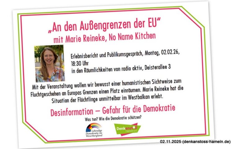 Hameln, 15.01.2026: – Kinder im Niemandsland – Erlebnisbericht, Videosequenzen u. Publikumsgespräch. Mo. 02. Februar 2026, 18:30 Uhr in den Räumlichkeiten von radio aktiv, Deisterallee 3, 31785 Hameln Alle Infos: Montag. 02.02.26, 18:30 Uhr, in den Räumlichkeiten von radio aktiv, Deisterallee 3, 31785 Hameln Nach wie vor versuchen jedes Jahr tausende von Geflüchteten die EU über … Einladung: „An den Außengrenzen der EU“ mit Marie Reineke, No Name Kitchen weiterlesen