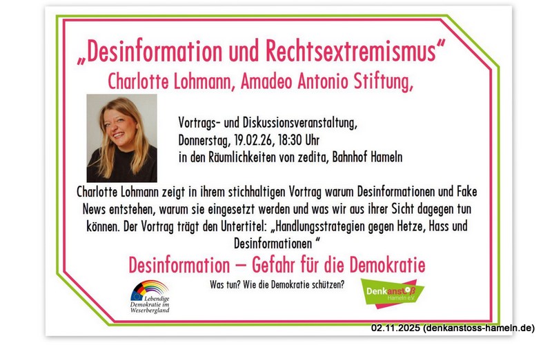 Hameln, Stand 02.11.2025: Erste Informationen zur Vortrags- und Diskussionsveranstaltung in den Räumlichkeiten von zedita, Bahnhof Hameln.