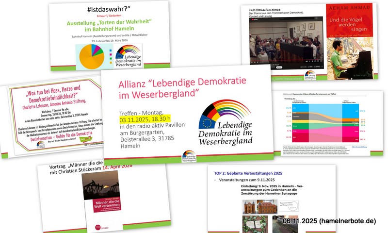Hameln, 06.11.2025: Die beiden nächste Treffen der Allianz sind für jeweils Montag dem 1.12. und 5.01.2026 immer um 18.30 Uhr in den Räumen von radio aktiv am Bürgergarten festgelegt. Am 17.11. trifft sich um 18.30 Uhr die AG „Torten der Wahrheit“ zur Planung der Bahnhofsausstellung gleichfalls bei radio aktiv.