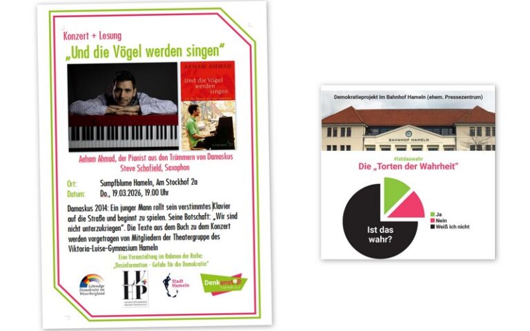 Hameln, 10.02.2026: Donnerstag, 19.03.26 – Konzert und Lesung: Und die Vögel werden singen, Sumpblume, Saal | 20 Uhr | Eintritt frei Weitere Infos: Aeham Ahmad wuchs als palästinensischer Flüchtling im syrischen Flüchtlingslager Yarmouk in Damaskus auf. Seit seinem fünften Lebensjahr lernte er Klavier spielen, zunächst im Konservatorium in Damaskus, von 2006 bis 2011 studierte er … Einladung: Konzert und Lesung: Und die Vögel werden singen weiterlesen