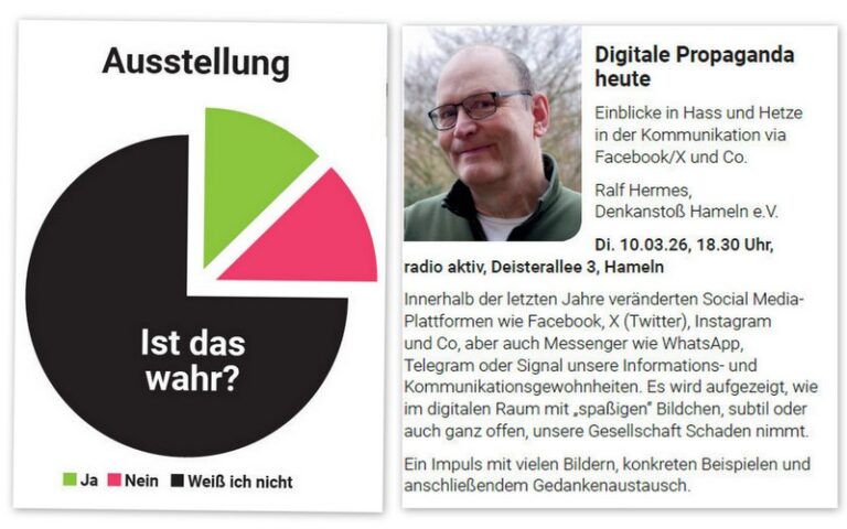 Hameln, 27.02.2026: Einblicke in Hass und Hetze in der Kommunikation via Facebook/X und Co. Im Rahmen der Veranstaltungsreihe: „Desinformation – Gefahr für die Demokratie“ laden wir in Kooperation mit der Allianz „Lebendige Demokratie im Weserbergland“ und anderen Partner ein: Dienstag, 10.03.2026 um 18.30 Uhr in den Räumen von radio aktiv, Deisterallee 3, Hameln Innerhalb der … Einladung: Vortrag und Gespräch: „Digitale Propaganda heute“ weiterlesen